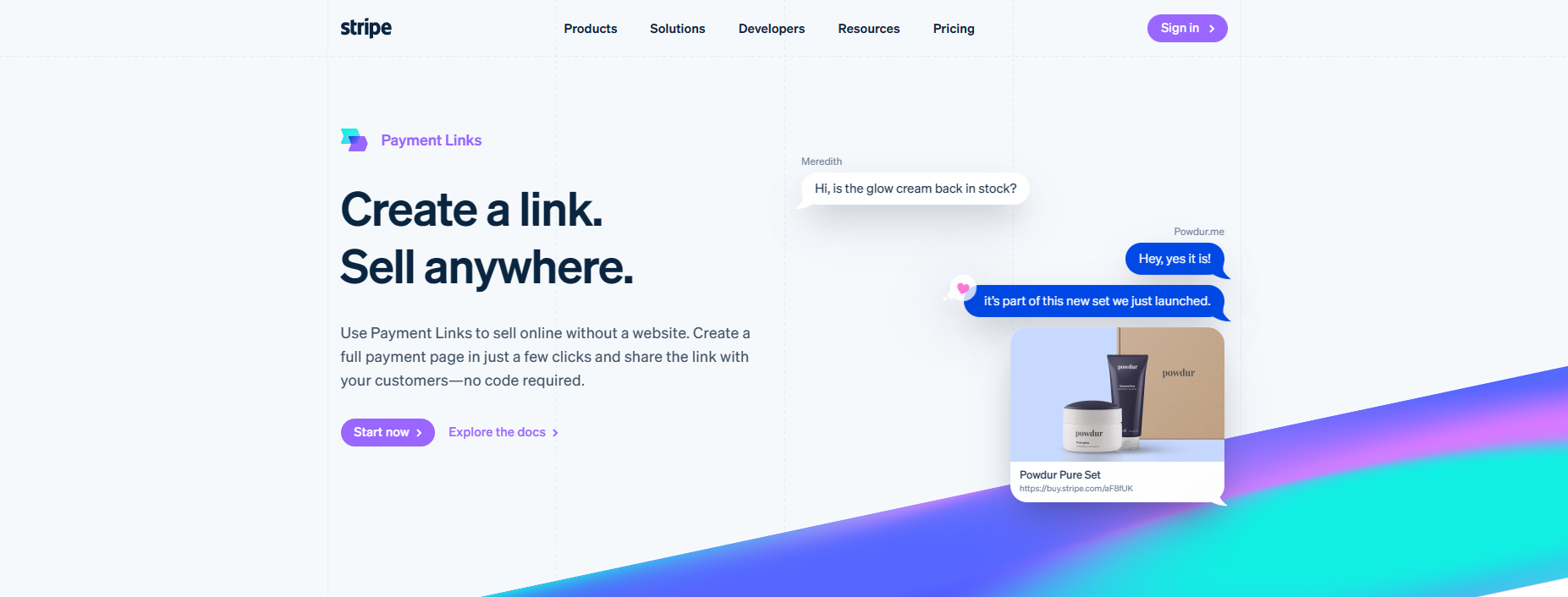 Stripe Payment is a tool that brands use to make online payments smoother. It allows you to make a payment page and send its link to clients via SMS, email, social media, or any platform without coding.