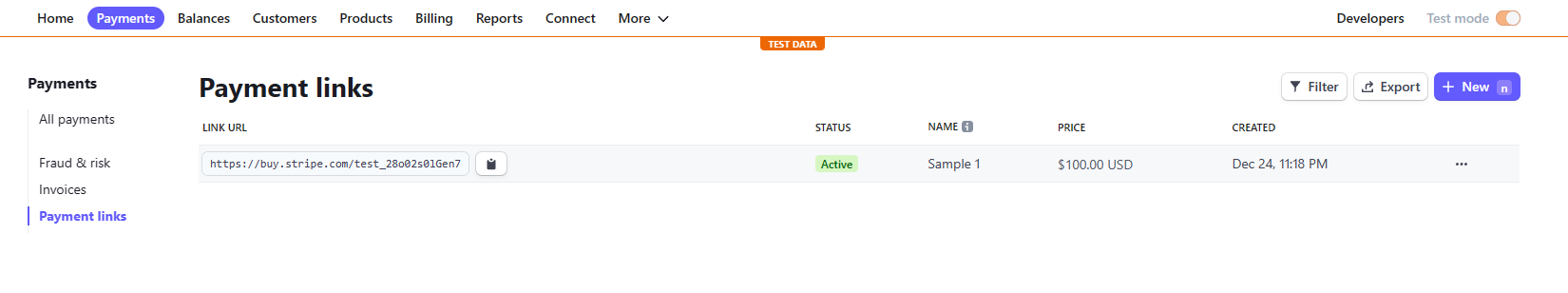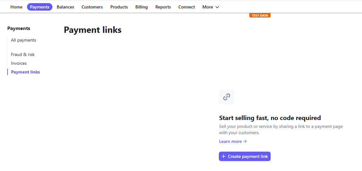 - Inside Payments, click on Payment links on the right menu and choose + Create payment link.