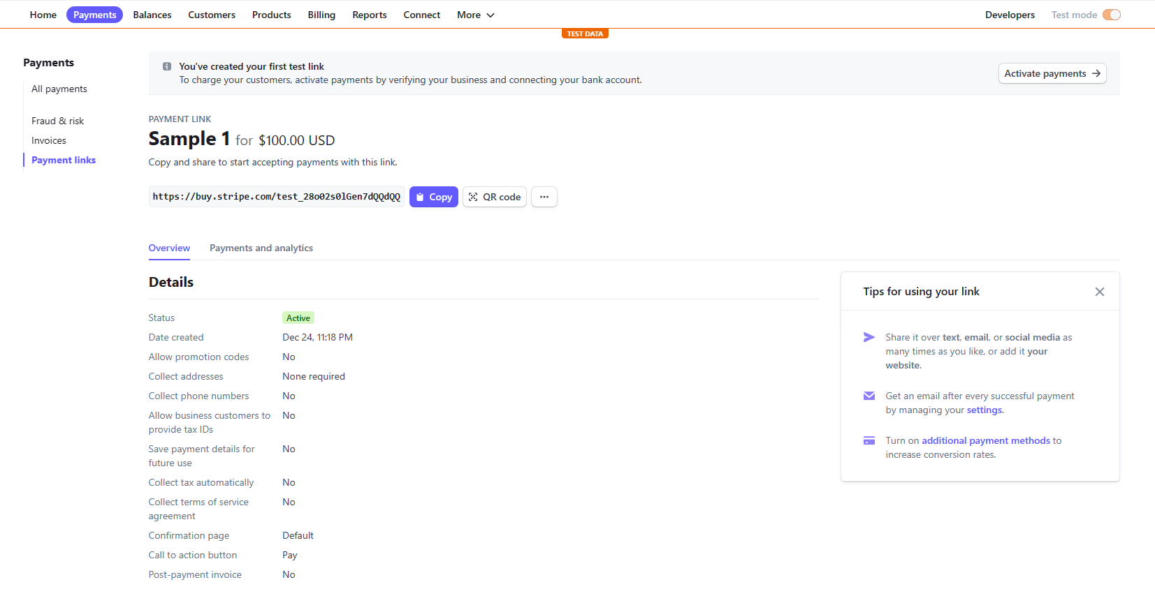- Your link to your payment page will then appear on your Payment links view. You should see the URL to your payment page in the overview. If you click on the row of the payment link, you should see it in detail, as well as the option to make a QR code for easier payments.