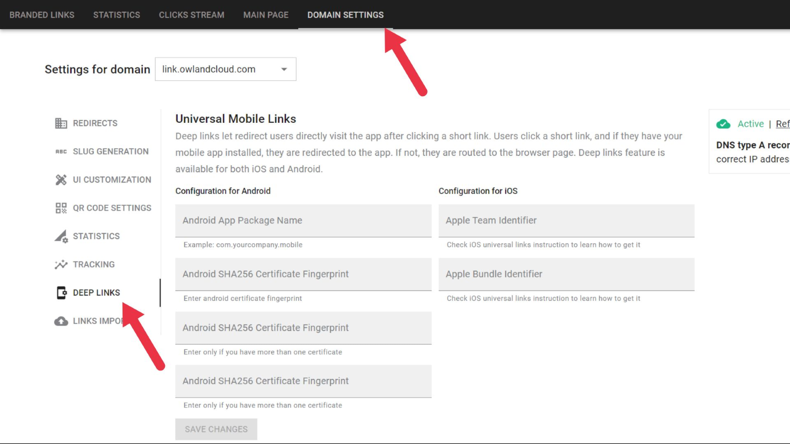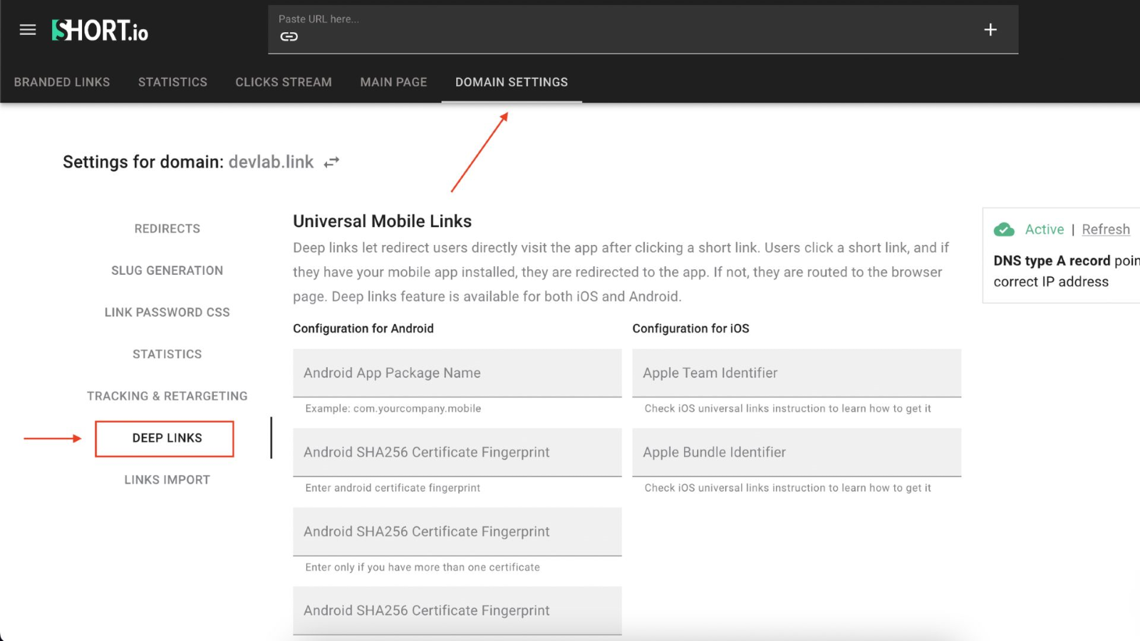 - Go to Short.io and open Domain Settings.