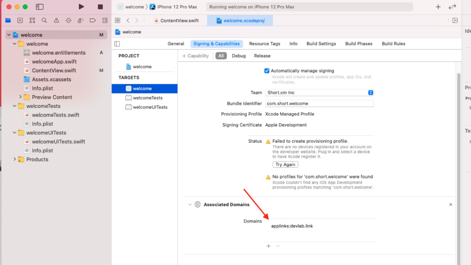 - Add Associated Domains; use the following format: applinks:yourshort.domain