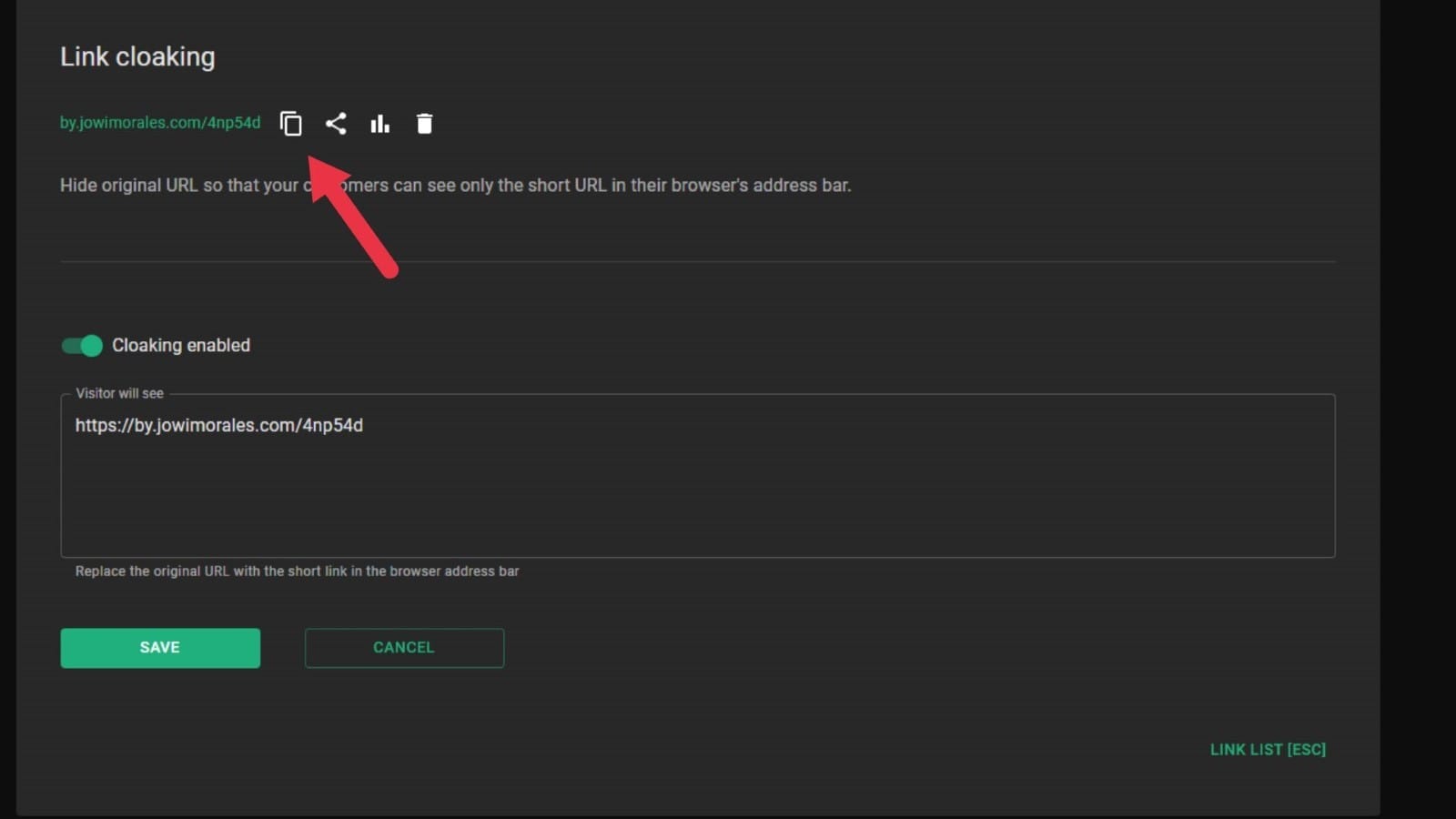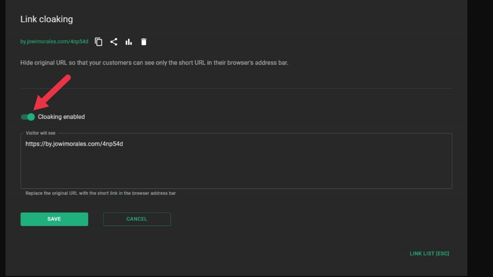- After you’ve been redirected to the Link Cloaking settings, click the toggle button to cloak your link.