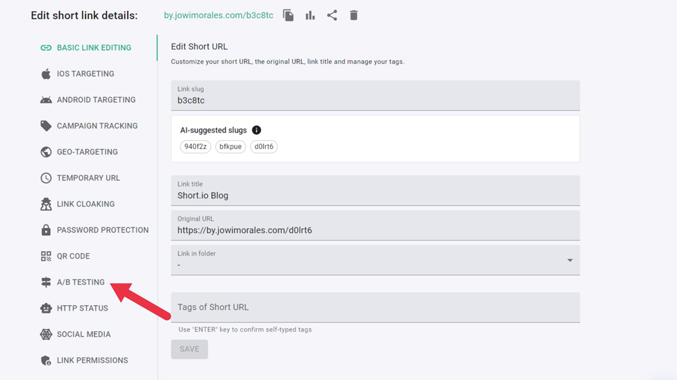- Under the Edit short link details tab, click A/B Testing.