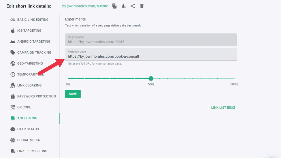 - Slide the button to edit the percentage of visitors you want to be led to the second URL.