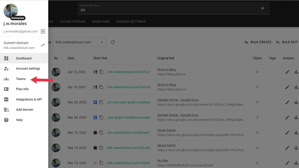 The Teams feature provides a centralized platform for marketers to manage access to their link statistics. Instead of navigating through different tools or platforms to control access, marketers can easily handle everything within Short.io.