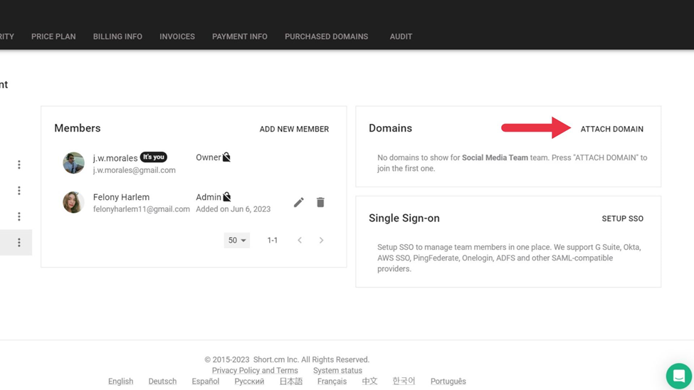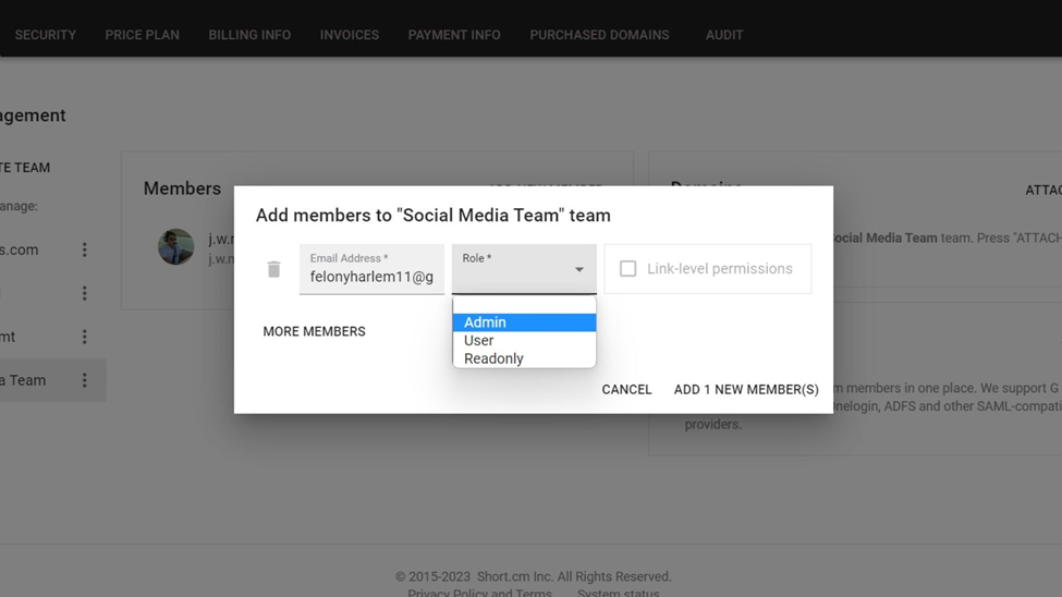 First, a Short.io team has four roles: owner, admin, user, and read-only. There can only be one owner, but there can be an unlimited number of admins, users, and read-only accounts.
