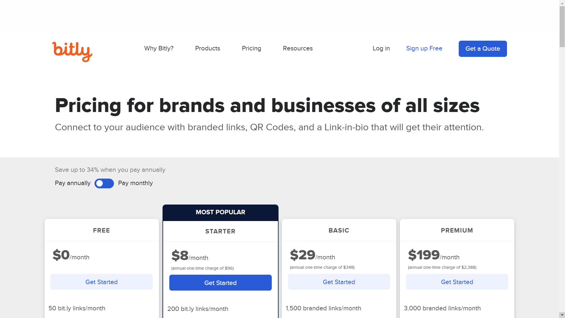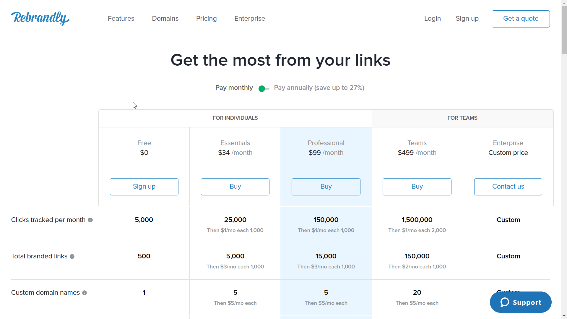 Bitly is significantly cheaper than Rebrandly. While Rebrandly’s paid plan starts at US$ 34.00, Bitly’s most affordable plan (aside from the free plan) starts at US$ 8.00 a month—but only if you pay for it annually at US$96 a year. It then goes up to US$ 35.00 for the Basic Plan and US$ 300 a month for its Premium Plan. Like Rebrandly, they offer customizable pricing as well.