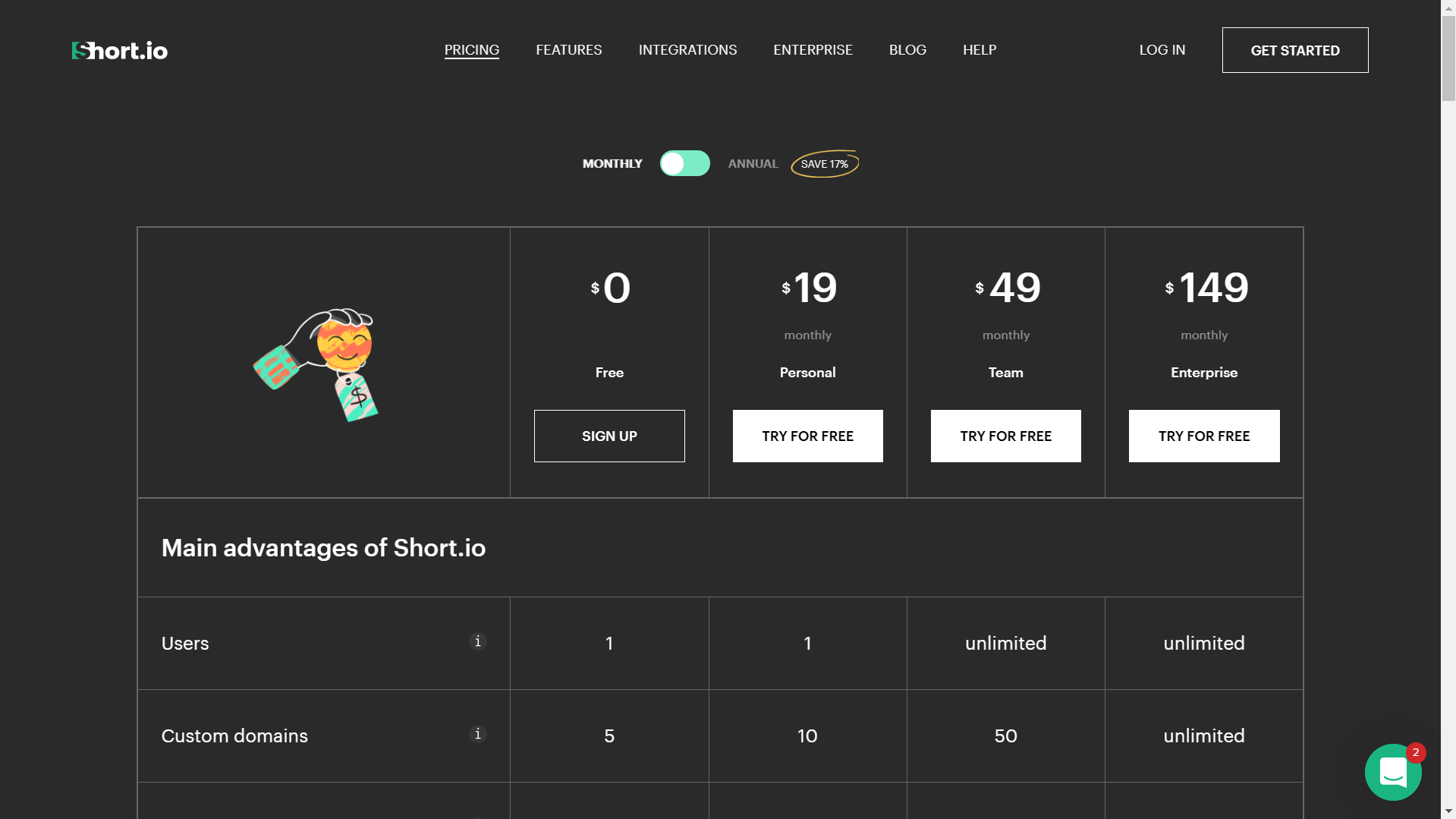 In terms of pricing, Short.io can be rigid. Of course, it has a free plan, but it also has three fixed plans. Their price starts at US$ 19.00 for personal users and climbs to US$ 49.00 for a small team. Finally, it has a US$ 149.00 monthly plan for Enterprise users. And if you choose an annual subscription to any Short.io plan, you automatically get two months free, giving you great value.
